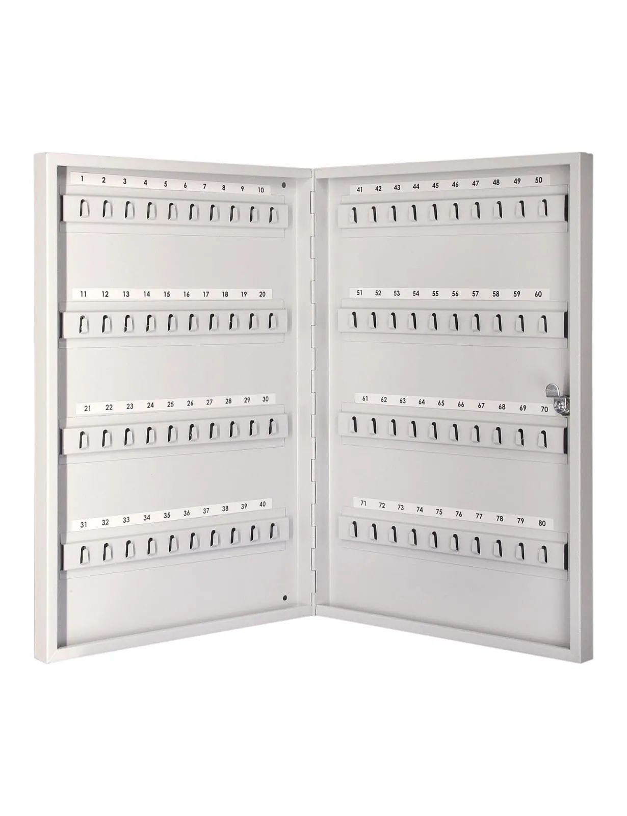Ключница на 80 ключей представляет собой компактное устройство для удобного хранения большого количества ключей. Ключница комплектуется 8 планками с крючками, что позволяет легко организовать хранение и быстро находить нужный ключ.На задней стенке корпуса расположены отверстия для крепления. В дверь установлен замок типа «Cam-Lock».