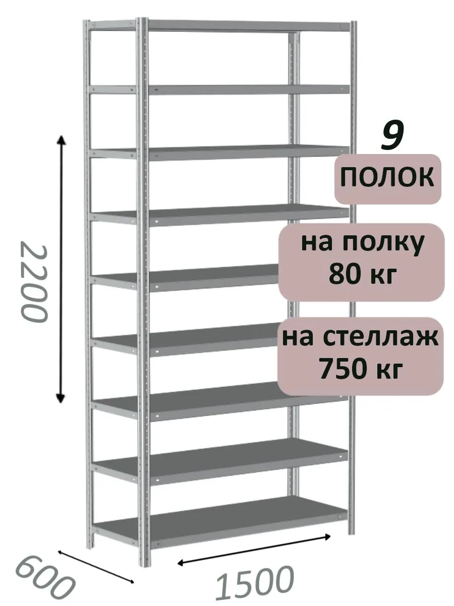 Стеллаж металлический полочный МС-750 2200х1500х600, 9 полок, светло-серый