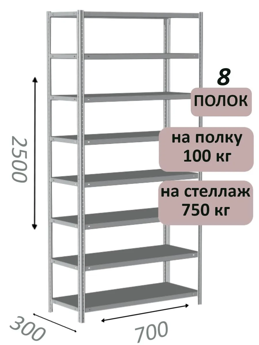 Стеллаж металлический полочный МС 2500х700х300, 8 полок, 100 кг на полку, светло-серый