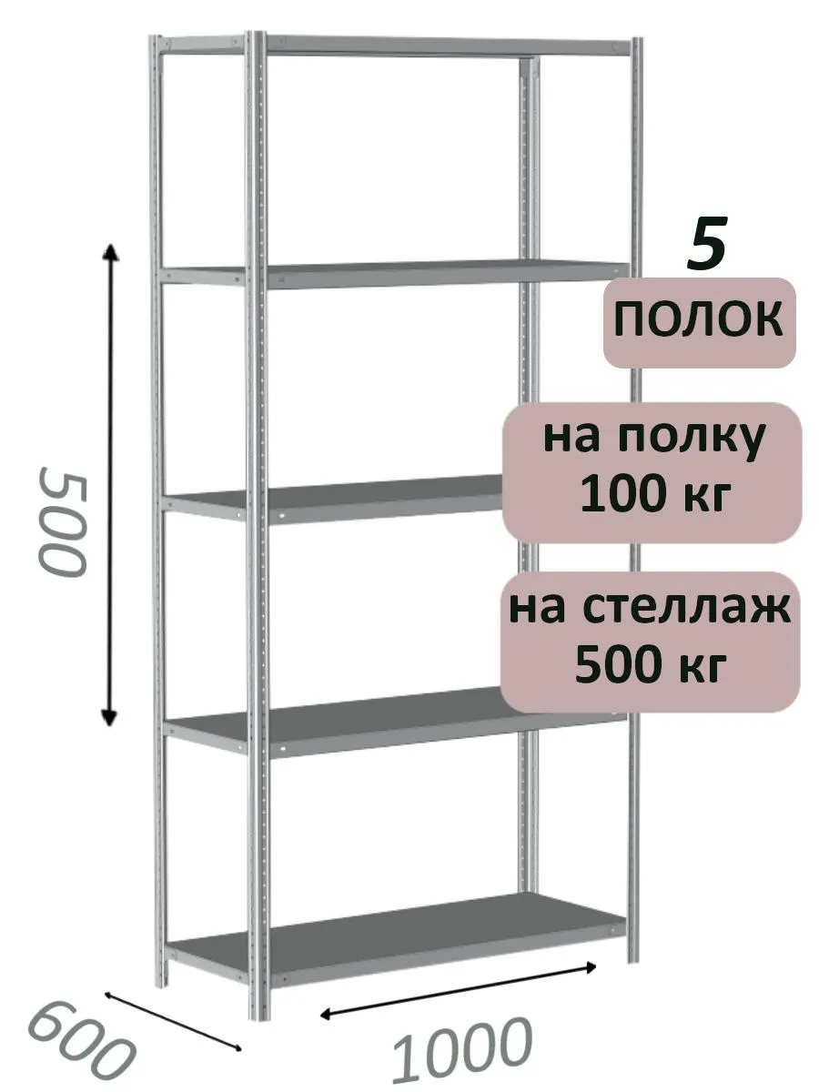 Стеллаж металлический полочный МС-500 500х1000х600, 5 полок, светло-серый