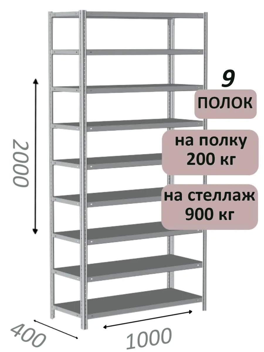 Стеллаж металлический полочный МС-900 2000х1000х400, 9 полок, светло-серый