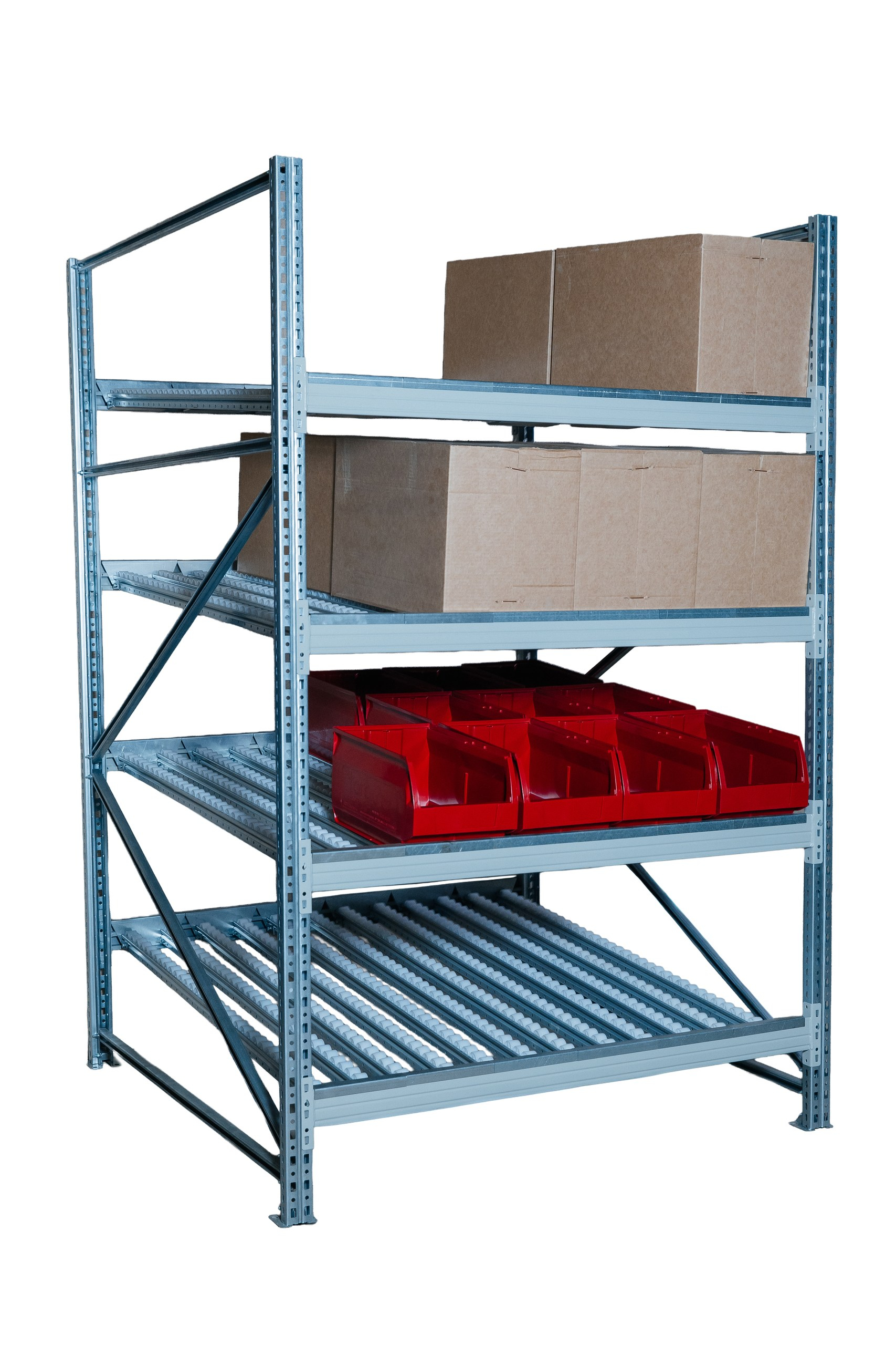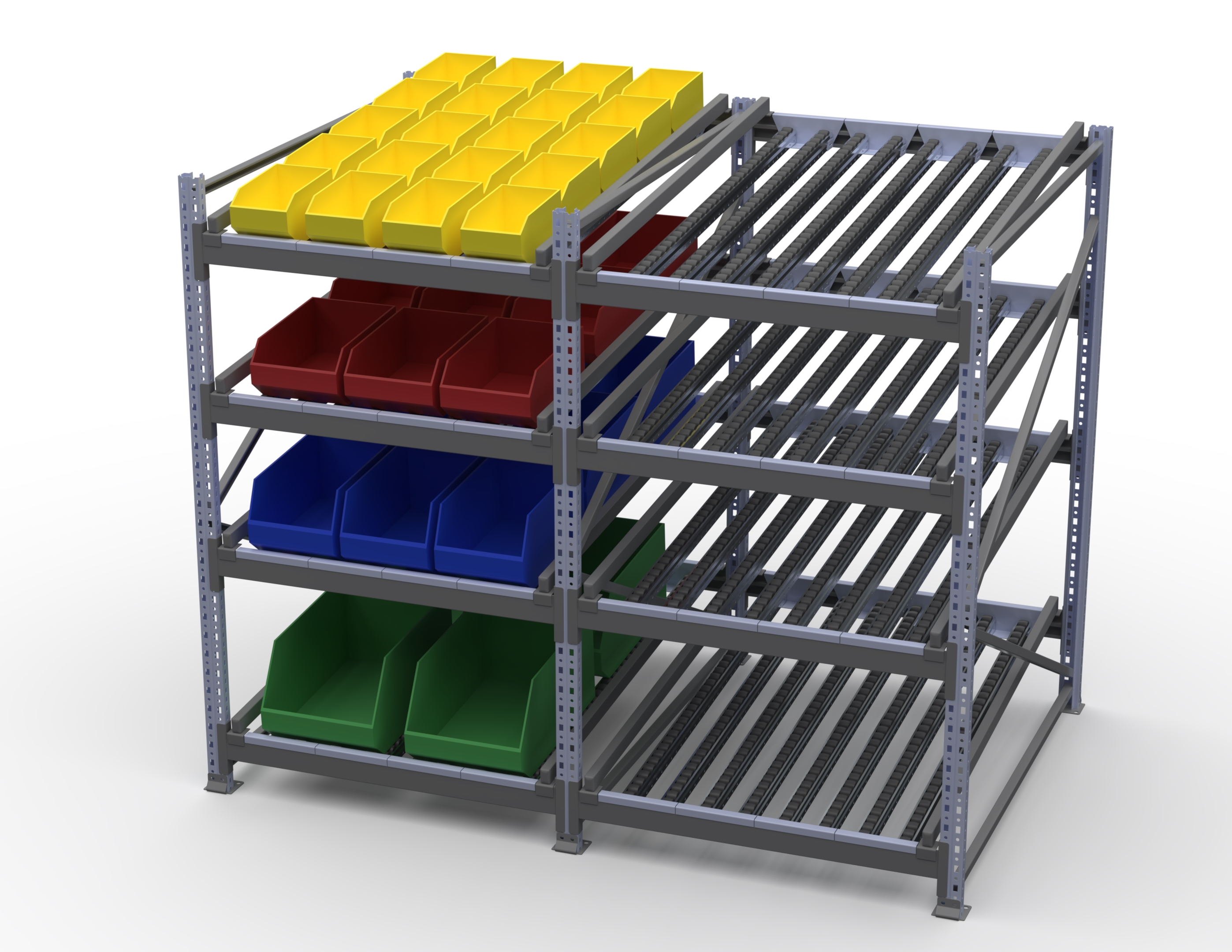 Гравитационный стеллаж с роликовыми полками 1600х900х1300, 4 яруса